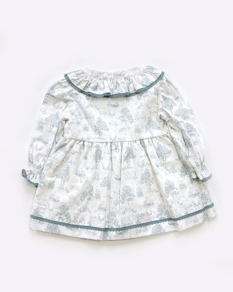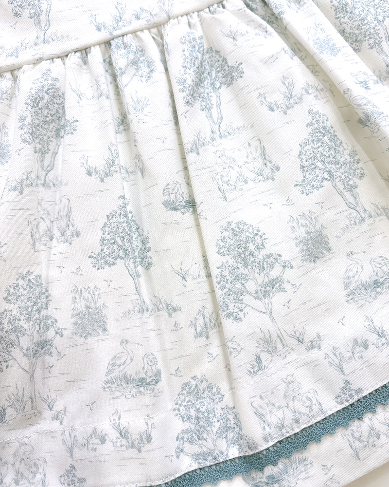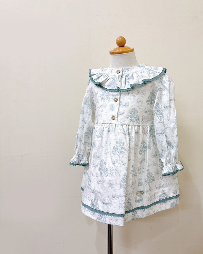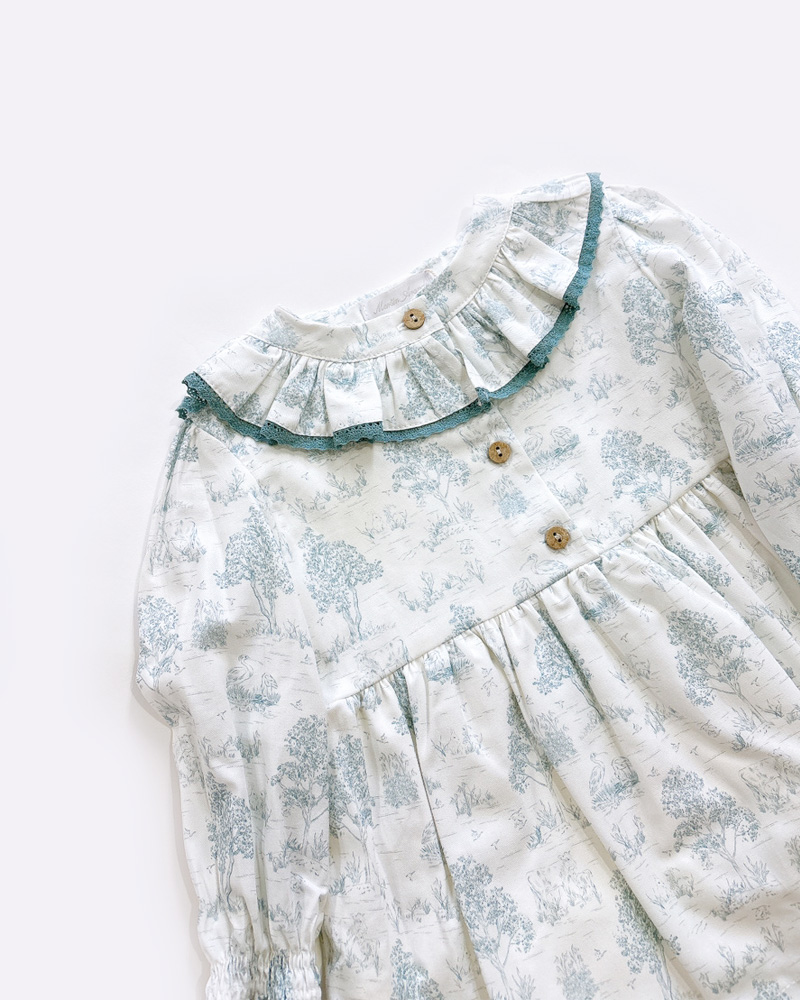 柔らかなコットン生地に、上品なブルーグリーンのプリントを施し、クラシカルな気品が漂います。